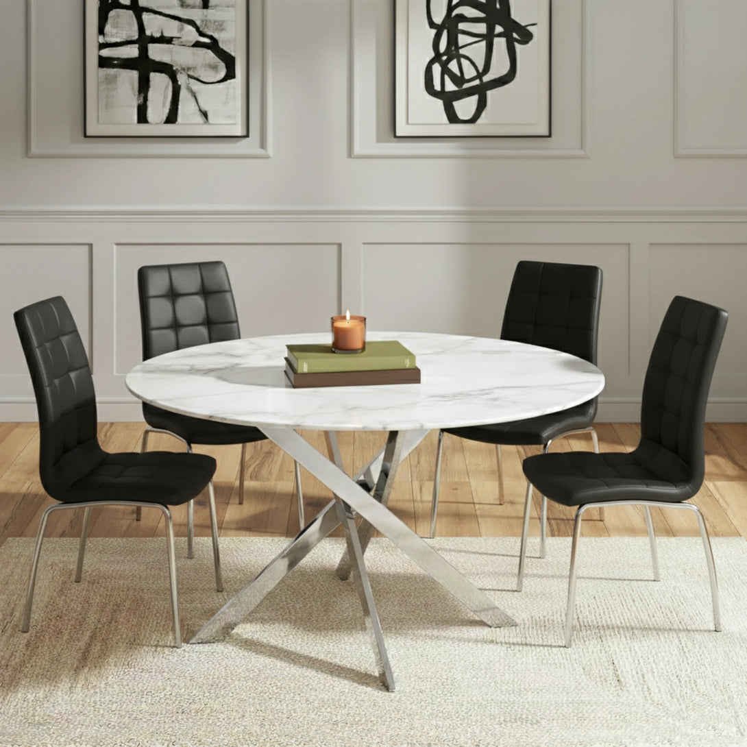 The Astrid Dining Set combines sophisticated design with practical elegance. It features four black leather-effect chairs with high backs and sleek chrome legs, offering both comfort and contemporary style. The set includes a 1.2m round dining table with a white and grey marble-effect top, supported by a silver frame with gracefully curved legs. This set brings a modern yet timeless appeal to your dining area, perfect for both everyday meals and stylish entertaining.