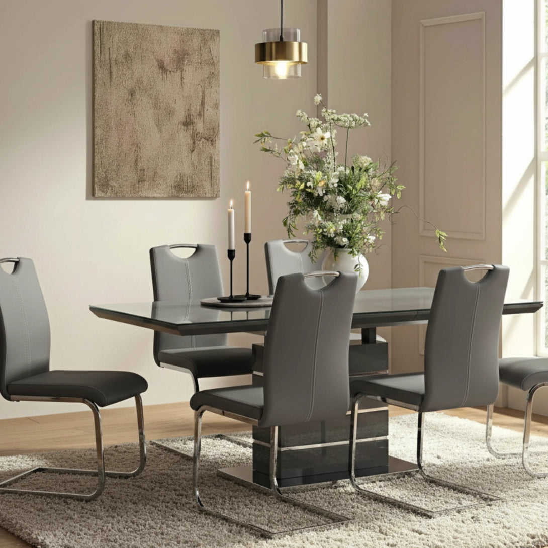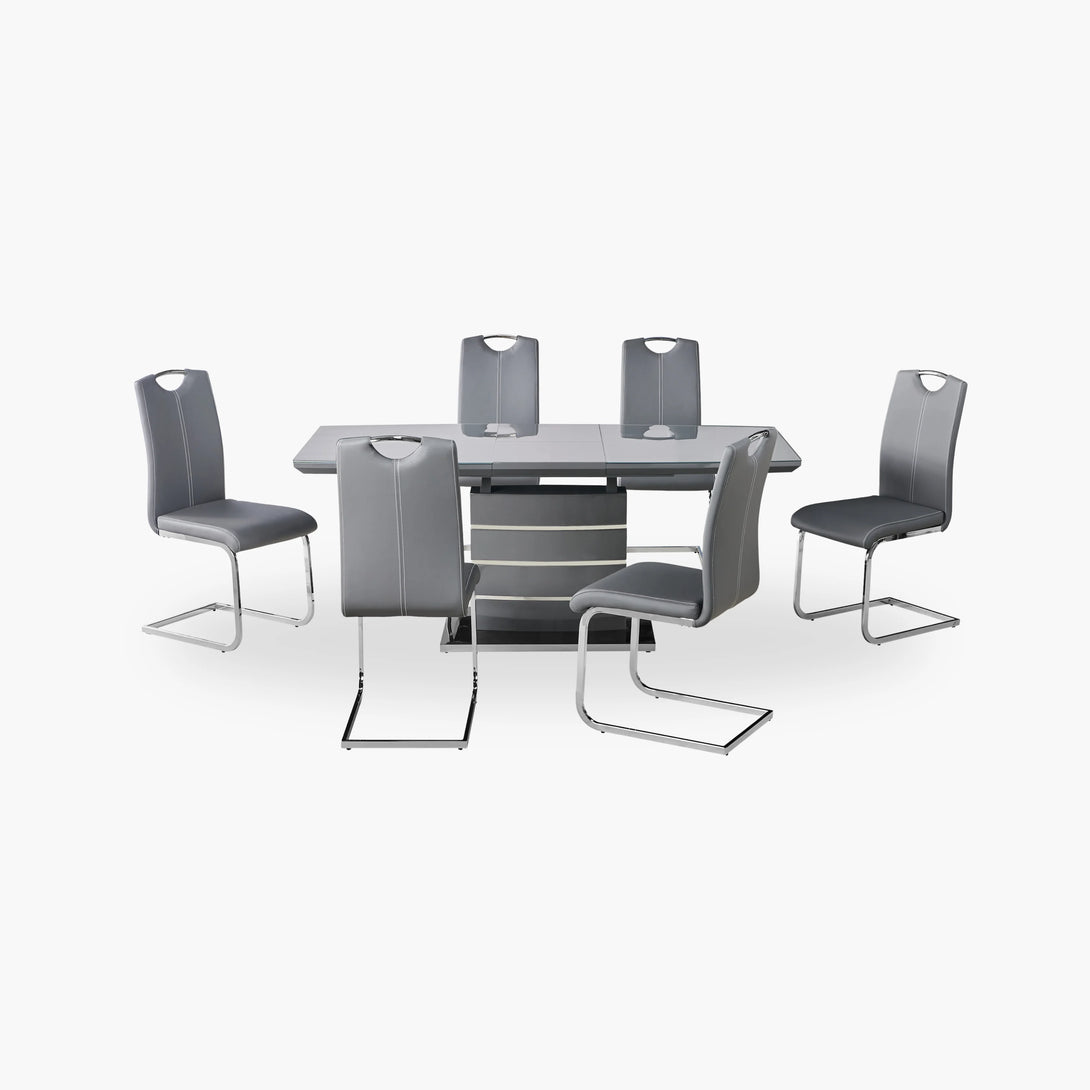 The Milan Dining Set features a sophisticated grey extending table complemented by six matching grey chairs with sleek silver chrome metal legs. Designed for versatility and style, this set offers ample space for gatherings while maintaining a modern, cohesive aesthetic. Its durable construction ensures long-lasting use, making it a practical and elegant addition to any dining area.